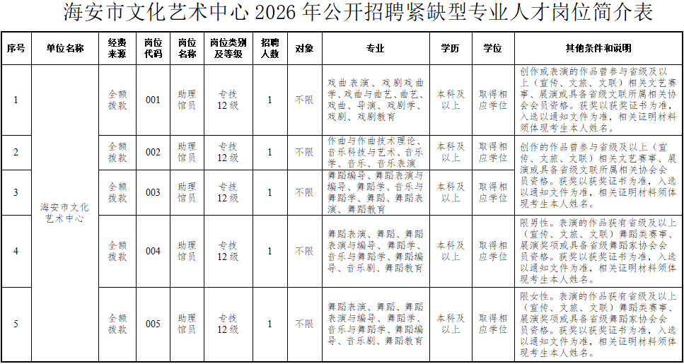 招聘岗位及招聘条件等详见《海安市文化艺术中心2026年公开招聘紧缺型专业人才岗位简介表》(附件1,以下简称《岗位简介表》)。《岗位简介表》在南通市人力资源和社会保障网(https://rsj.nantong.gov.cn)、海安市人民政府网(https://www.haian.gov.cn,政府信息公开-法定主动公开内容-招考录用-事业单位招录)查询。
