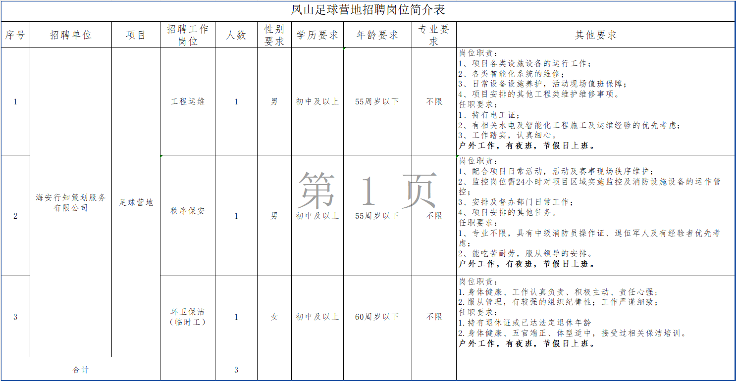 工程运维(1名)、秩序保安(1名)、环卫保洁(临时工1名),合计人数3人。